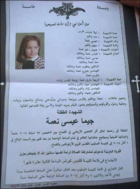 H 15χρονη ελληνορθόδοξη Nehme Jima Issa σκοτώθηκε στις 27 Φεβρουαρίου σε μία τρομοκρατική επίθεση που προκάλεσαν ισλαμιστές στην περιοχή Qasaa στην βορειοανατολική Δαμασκό.Η κηδεία της θα πραγματοποιηθεί αύριο Σάββατο 1 Μαίου στην ελληνορθόδοξη εκκλησία του Τιμίου Σταυρού στη Δαμασκό.(Pro Christianis 27/02/14)