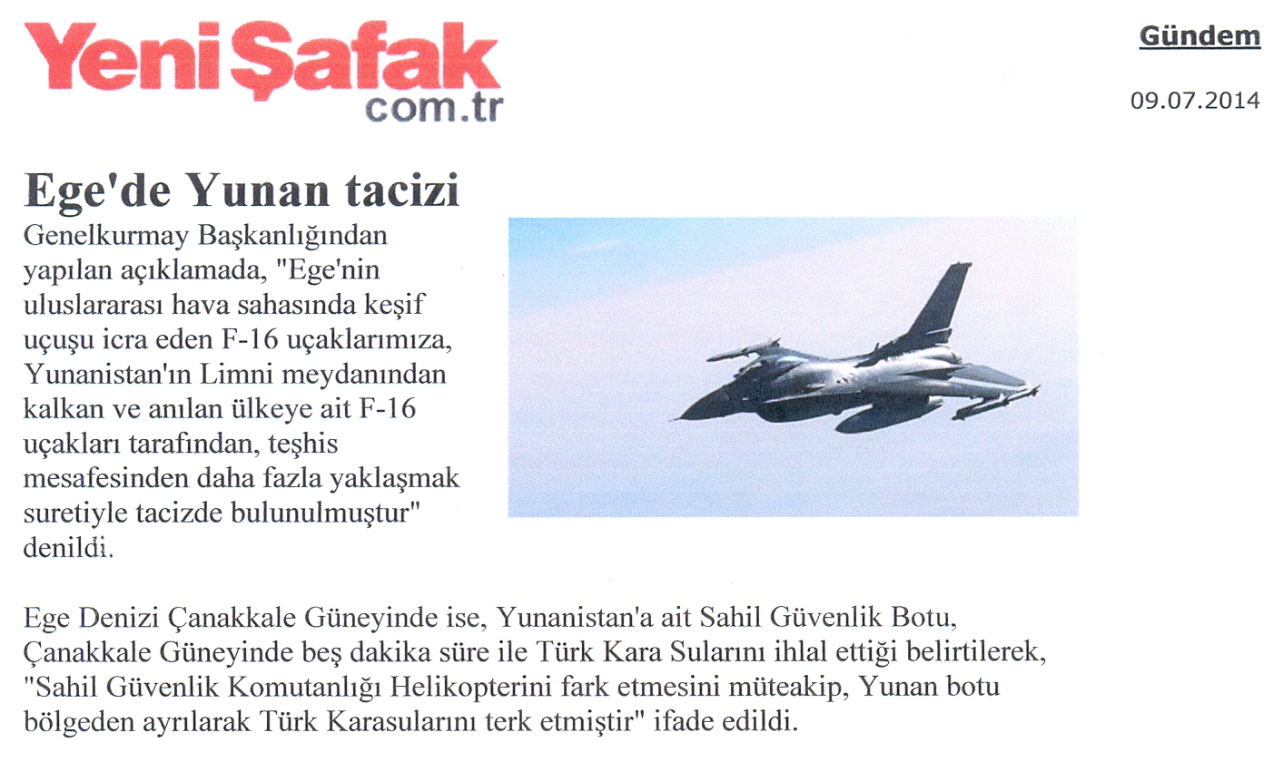 Εκτός όμως από αυτό το επεισόδιο είχαμε και νέο «πάρτι» στον εναέριο χώρο του Αιγαίου, πάλι σύμφωνα με τις επίσημες ανακοινώσεις του τουρκικού Γενικού Επιτελείου. Σύμφωνα και με δημοσίευμα της φιλοκυβερνητικής τουρκικής εφημερίδας, Yeni Şafak, (10/7), την ίδια μέρα που έγινε το επεισόδιο με το πλοίο της ελληνικής ακτοφυλακής, στον εναέριο χώρο της περιοχή της Λήμνου ελληνικά μαχητικά αεροσκάφη παρενόχλησαν τουρκικά F16 που έκαναν «εκπαιδευτική» πτήση στην περιοχή, (η συνηθισμένη τουρκική αιτίαση για τις κατάφορες παραβιάσεις του ελληνικού εναέριου χώρου). Τα ελληνικά πλησίασαν επικίνδυνα τα τουρκικά με αποτέλεσμα να διεξαχθούν επικίνδυνες αερομαχίες στην ευρύτερη περιοχή της Λήμνου.