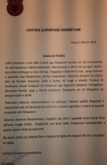 Η πολιτική δήλωση, μεταξύ άλλων αναφέρει ότι «η συμφωνία της Οχρίδας δεν εφαρμόζεται. Περαιτέρω επέκταση εφαρμογής, της σοβινιστικής προσέγγισης της σκοπιανής κυβέρνησης προς τους Αλβανούς. Οι « Μακεδόνες» τρομοκρατούν μέσω της σοβινιστικής κυβέρνησης τους, τις αλβανικές οικογένειες οποτεδήποτε, οπουδήποτε σε δρόμους και σχολεία. Με μυστική διαδικασία, ομάδες χούλιγκαν «ενορχηστρωμένες» από τις σκοπιανές μυστικές υπηρεσίες παραβιάζουν οικογενειακά άσυλα, και τις γειτονιές των αλβανών . Οι Αλβανοί που ζουν στην ΠΓΔΜ σήμερα βιώνουν μια « κρύα νύκτα» . Καλέστε τον διεθνή παράγοντα να παρέμβει, κυρίως τον αλβανικό πολιτικό παράγοντα στην κυβέρνηση, και δείτε ρεαλιστικά την θλιβερή κατάσταση του αλβανικού λαού στην ΠΓΔΜ . Η κυβέρνηση της πΓΔΜ είναι σοβινιστική, και καθοδηγεί καθημερινά λίγο –λίγο την χώρα προς την ρωσική και σερβική φωλιά. Οι Αλβανοί δεν το θέλουν αυτό. Η Ευρω-Ατλαντική ενσωμάτωση της περιοχής θα οδηγήσει σε ευημερία. Θέλουμε να μοιραζόμαστε την ίδια μοίρα της χώρας , την ελευθερία και τις ίδιες ευκαιρίες», καταλήγει η πολιτική δήλωση του Αλβανικού Εθνικού Απελευθερωτικού Στρατού.