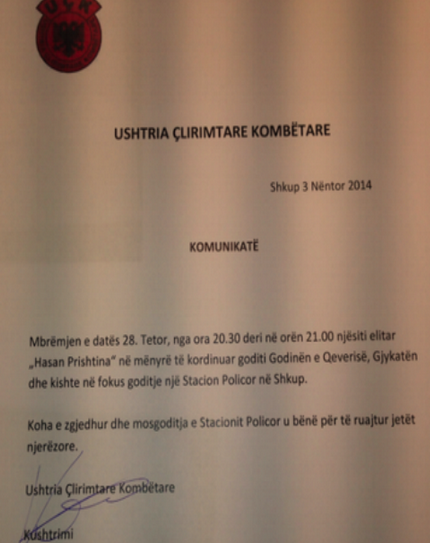 «Το βράδυ της 28ης Οκτωβρίου, από τις 20:30 μ.μ έως τις 21:00 μονάδα ελίτ με την επωνυμία «Hasan Prishtina», σε μια συντονισμένη ενέργεια είχε σκοπό να «χτυπήσει», την βουλή , το γενικό Δικαστήριο και ένα αστυνομικό τμήμα, στα Σκόπια. Τελικά χτυπήθηκε μόνο η Βουλή. Ο χρόνος που επιλέχθηκε, και τελικά δεν πραγματοποιήθηκε η επίθεση στον αστυνομικό σταθμό, έγινε για να σωθούν ανθρώπινες ζωές », ανέφερε το ανακοινωθέν, το οποίο τέλος υπάρχει και μια πολιτική δήλωση.
