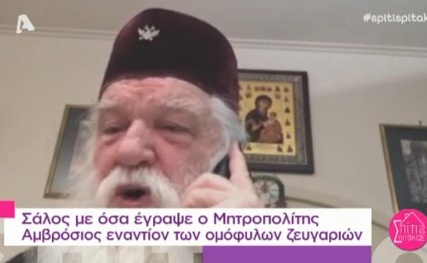 Στην εκπομπή "Σπίτι μου σπιτάκι μου" μίλησε ο Μητροπολίτης Καλαβρύτων και Αιγιαλείας Αμβρόσιος και για μια ακόμα φορά συνέχισε το παραλήρημά του κατά των ομοφυλοφίλων, ενώ απάντησε και στον Γιώργο Λιάγκα με αχαρακτήριστες εκφράσεις.