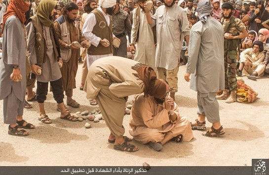 Πλήθος κόσμου παρακολουθεί τους τζιχαντιστές να τους λιθοβολούν μέχρι που συνθλίβονται τα κρανία τους.
