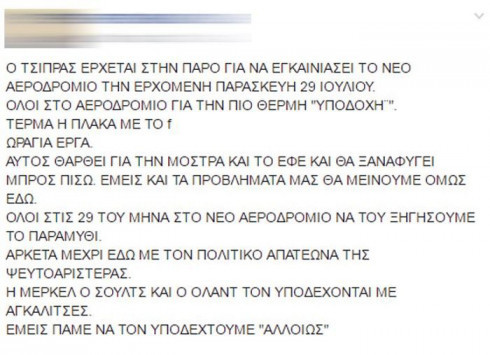 Πρωταγωνιστής της υπόθεσης ένας υπάλληλος της Δημοτικής Επιχείρησης Πολιτισμού του δήμου Πάρου, ο οποίος κρατούνταν επί 3,5 ώρες στο τοπικό Αστυνομικό Τμήμα, καθώς στον προσωπικό του λογαριασμό στο facebook ανέβασε εμπρηστικά σχόλια για την παρουσία του πρωθυπουργού Αλέξη Τσίπρα, στο νησί με αφορμή τα εγκαίνια του αεροδρομίου. Οι αναρτήσεις του κρίθηκαν ως επικίνδυνες από τις αρχές και στάθηκαν αρκετές ώστε να κινητοποιηθεί ο κρατικός μηχανισμός με τη Δίωξη Ηλεκτρονικού Εγκλήματος και την τοπική αστυνομία να επιλαμβάνονται της υπόθεσης. Με διαδικασίες fast track ο υπάλληλος εντοπίστηκε και τέθηκε υπό κράτηση για όση ώρα βρισκόταν σε εξέλιξη η φιέστα στο αεροδρόμιο. Δείτε παρακάτω τις αναρτήσεις που προκάλεσαν την κινητοποίηση των αρχών και έβαλαν σε περιπέτειες τον πρωταγωνιστή της υπόθεσης...