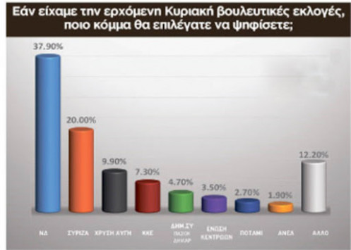 Σύμφωνα με τη δημοσκόπηση, η ΝΔ λαμβάνει στην πρόθεση ψήφου 37,9%, ο ΣΥΡΙΖΑ 20%, η Χρυσή Αυγή 9,9%, το ΚΚΕ 7,3%, η ΔΗ.ΣΥ.(ΠΑΣΟΚ) 4,7%, η Ενωση Κεντρώων 3,5%, το Ποτάμι 2,7% και οι ΑΝΕΛ 1,9%.