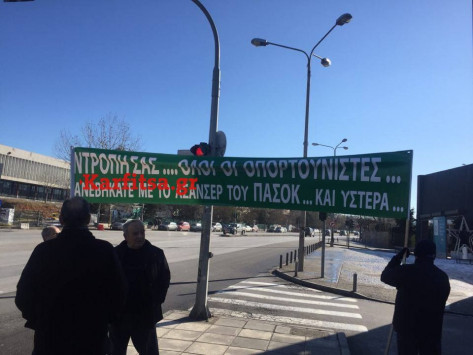 Ωστόσο δεν έλειψαν και τα παρατράγουδα.... Λίγο πριν αρχίσει η εκδήλωση στην εμπορική πύλη της ΔΕΘ, μέλη του ΠΑΣΟΚ, που δήλωσαν ότι λειτούργησαν ως πρόσωπα", άνοιξαν ένα πράσινο πανό... υποδοχής στους τρεις πρώην υπουργούς, το οποίο έγραφε: "Ντροπή σας... όλοι οπορτουνιστές... ανέβηκαν με το ασανσέρ του ΠΑΣΟΚ... και ύστερα..."