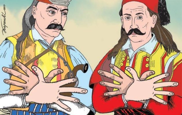 Ένα σκίτσο που έχει αναρτηθεί στα μέσα κοινωνικής δικτύωσης και δείχνει τους ήρωες της Ελληνικής Επανάστασης, Θεόδωρο Κολοκοτρώνη και Μάρκο Μπότσαρη να σχηματίζουν με τα χέρια τους τον αλβανικό αετό, έχει προκαλέσει αναστάτωση.