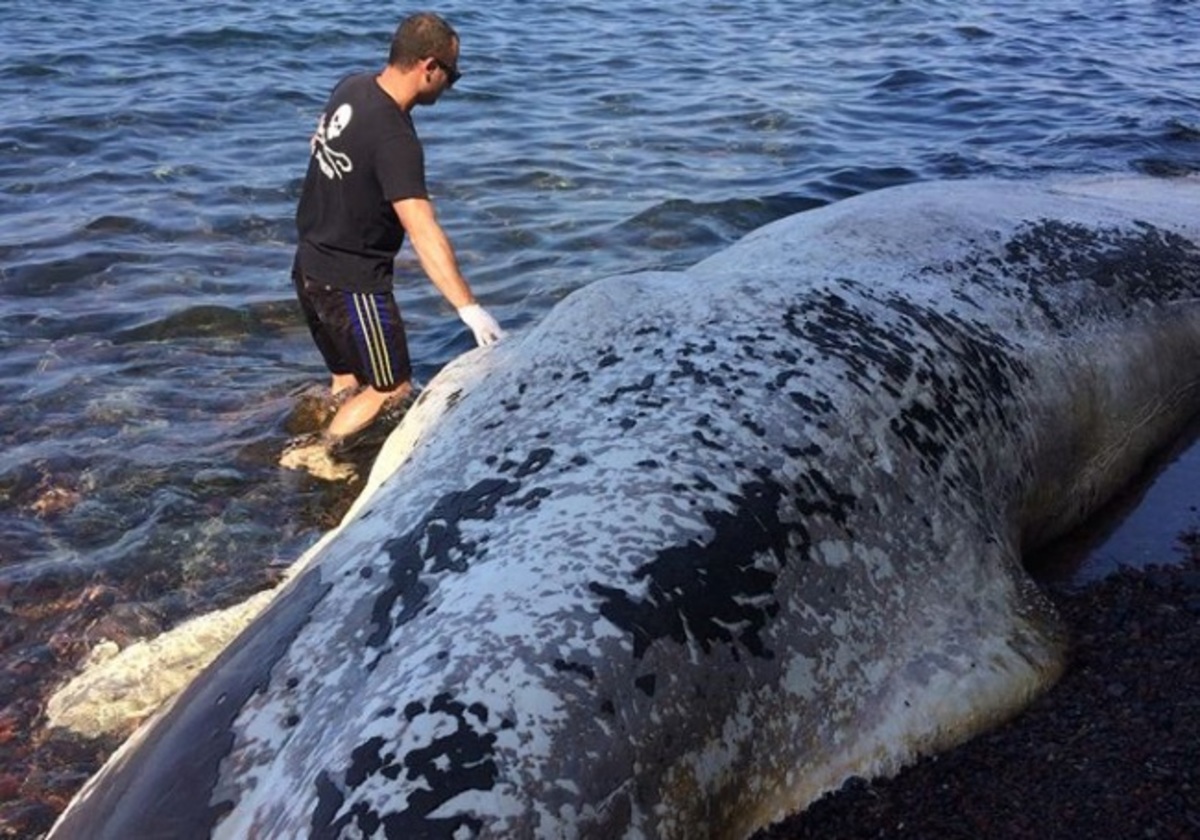 «Είναι μια μεγάλη φάλαινα που την έβγαλε η θάλασσα έξω και δυστυχώς δεν την πήρε είδηση κανείς» λέει ο δύτης που έφτασε στο σημείο και συνεχίζει: «η αίσθηση είναι περίεργη μπροστά σε μια τέτοια εικόνα».
