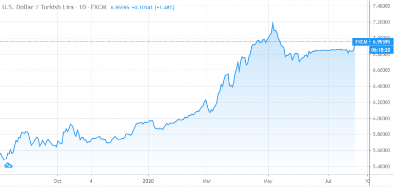 Το τουρκικό νόμισμα βυθιζόταν όλο και πιο πολύ κάθε μέρα σε σχέση με αμερικανικό δολάριο με τη σχέση ανταλλαγής να προσεγγίζει στα χειρότρά του στις αρχές Μαϊου: 7,2 τουρκικές λίρες για ένα δολάριο.