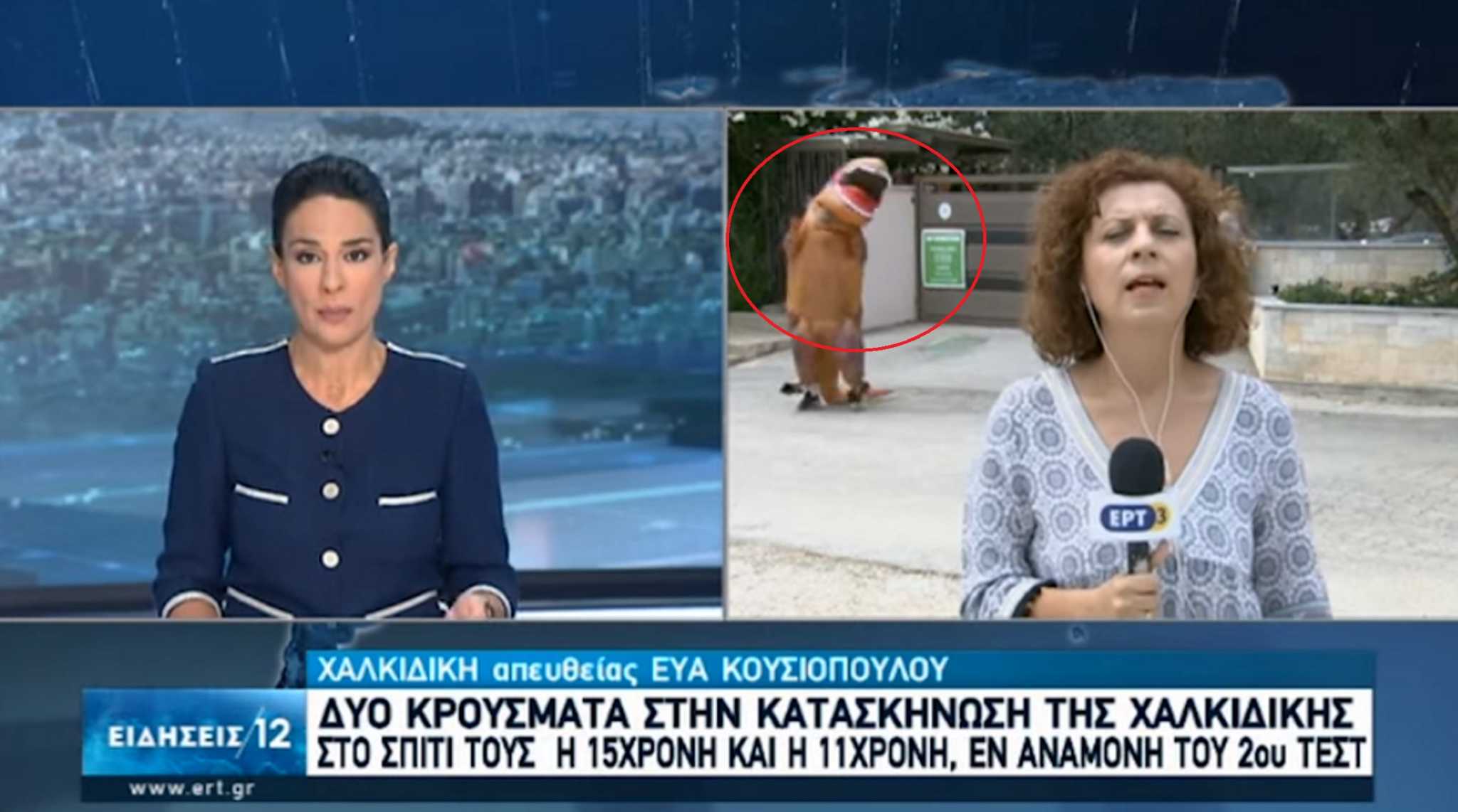 Την ώρα που η ρεπόρτερ Εύα Κουσιοπούλου ενημέρωνε για το δεύτερο κρούσμα κορονοϊού στην κατασκήνωση της Χαλκιδικής, ένας… δεινόσαυρος εμφανίστηκε εντός του χώρου, που βρίσκονταν πίσω της. Ο “δεινόσαυρος” βγήκε από την πόρτα και άρχισε να τρέχει, πηγαίνοντας μία από τη μία πλευρά και μία από την άλλη!