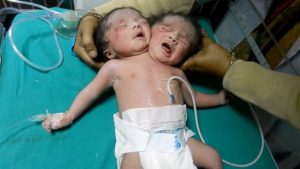 Αυτή η διαταραχή είναι γνωστή ως δικέφαλος parapagus dicefalik όπου δύο μωρά ενώνονται με έναν κορμό που συχνά οδηγεί σε θνησιγένεια. Όμως τα δίδυμα που συνδέονται από θαύμα έχουν επιζήσει μέχρι στιγμής και έχουν εισαχθεί σε νοσοκομείο κοντινής πόλης για να παρακολουθούνται από γιατρούς.