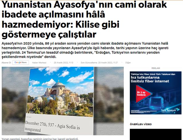 »Η Greek City Times προσπάθησε να παρουσιάσει το ιστορικό κτίριο ως “εκκλησία” και με τον σταυρό τοποθετημένο στην εικόνα που συνοδεύει την είδηση που αναφέρεται στην ιστορία και το παρόν της Αγίας Σοφίας.